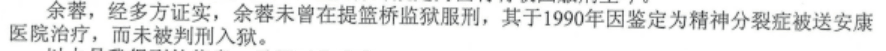 Response received in a 2006 communication to Dui Hua. “According to multiple sources, Yu never served a sentence in Tilanqiao Prison. He was diagnosed with schizophrenia in 1990 and was sent to receive treatment in an Ankang. He was not sentenced to imprisonment.