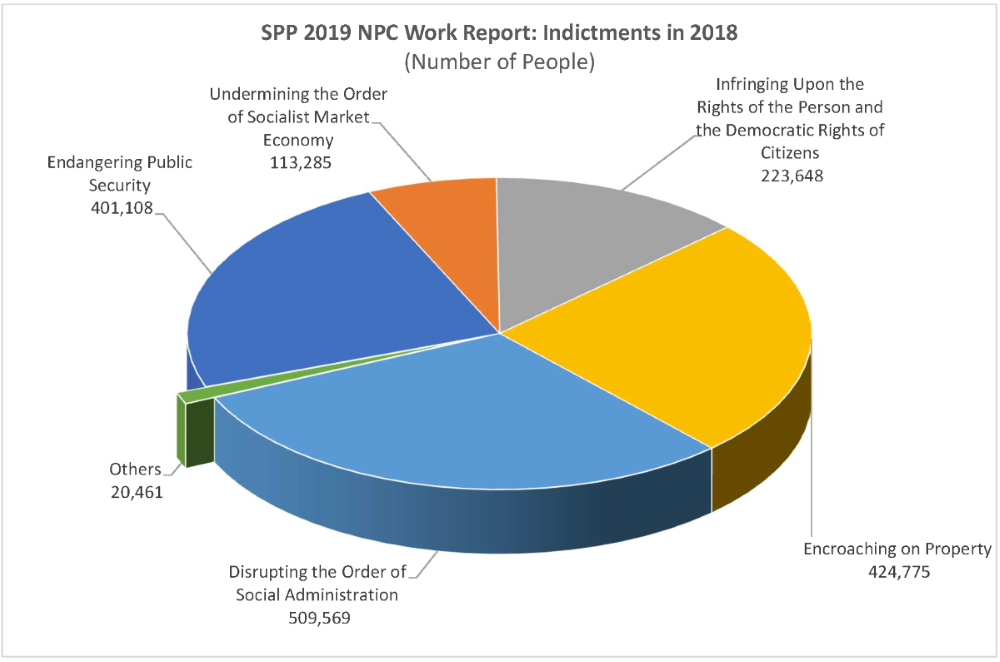 Although the Supreme People’s Court has taken the lead in advancing judicial transparency, the same cannot be said of other judicial organs. As noted above, the Ministry of Justice has, since 2015, declined to provide statistics on the number of juveniles and women in prison. In its 2019 work report for the National People’s Congress, the Supreme People’s Procuratorate groups the ten categories of crimes into six segments, putting endangering state security in with graft and bribery, endangering national defense, dereliction of duty, and dereliction of military duty. “By grouping endangering state security – the most serious political crime in the criminal law – with five other crimes,” Dui Hua’s executive director John Kamm pointed out, “it is virtually impossible to ascertain how many people were indicted for subversion, splittism, and other national security crimes by Chinese prosecutors in 2017.”