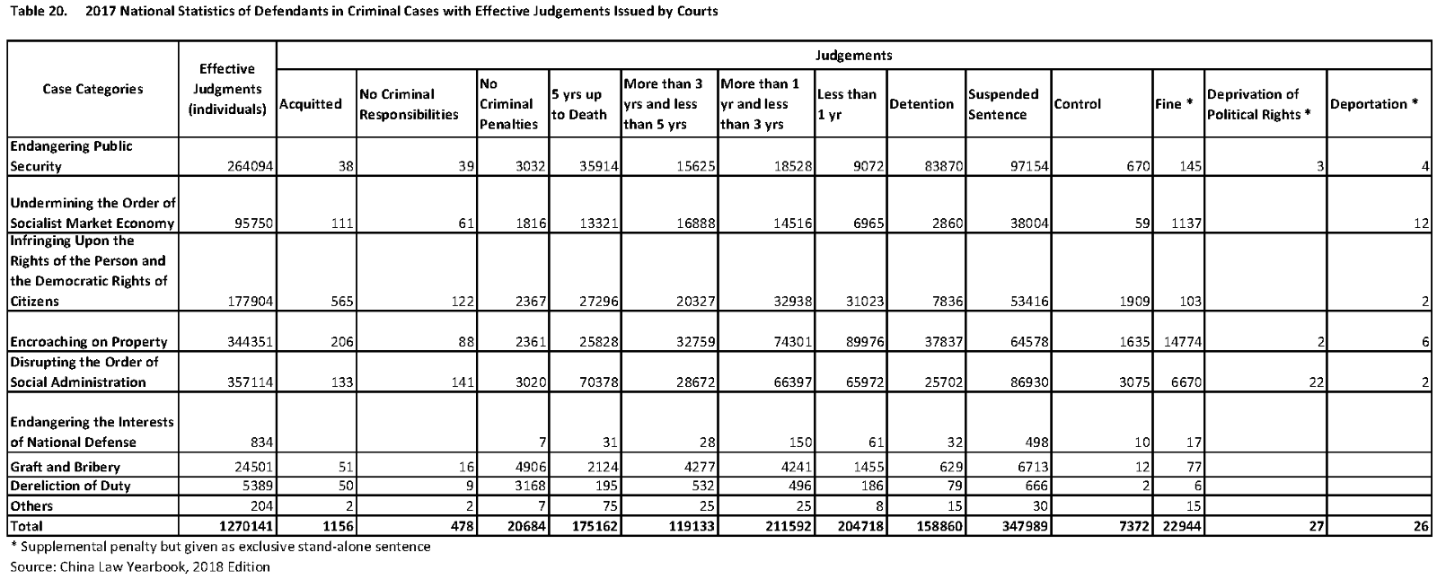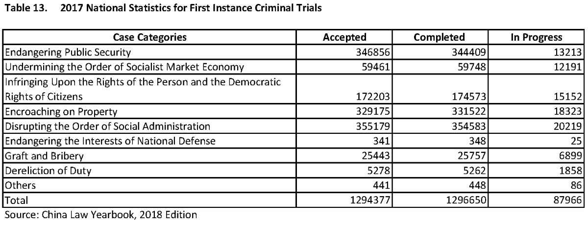 In an important development in judicial transparency, China has released detailed statistics on sentencing and convictions by Chinese courts in 2017. The statistics are broken down by crime, length of sentences, and age and gender of defendants. The statistics, compiled by the Supreme People’s Court, are provided in two tables in the China Law Yearbook, 2018 Edition, available for purchase in China but not overseas. The yearbook also provides, for the first time, the number of cases that have been accepted by courts for trials of the first instance that have not yet been concluded.
