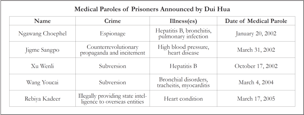 China has granted medical parole to serve politically expedient goals, effectively forcing many Chinese prisoners into exile so they would be less of a nuisance to Chinese leaders. From the early 1990s to early 2005, when China’s campaign against color revolutions began, Beijing secured favor with foreign governments by using medical parole to release high-profile political dissidents whose cases were of great concern abroad, especially in the United States. Medical parolees sent to the United States include, among others, Wei Jingsheng, Wang Dan, Jigme Sangpo, Xu Wenli, and Rebiya Kadeer (see table below for medical paroles announced by Dui Hua). These individuals left China on the grounds that they needed to receive medical treatment—though several were not especially ill—and also with an understanding that they will be re-incarcerated if they return to China.