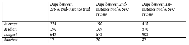 In approximately half of the cases, the time between first instance death penalty trial and SPC review is between six months to a year. On the other hand, in more than half of cases, the period from trial to SPC review took longer than a year; of those, nearly 33 percent took longer than one and a half years. Interestingly, a very small number of cases landed on opposite ends of the spectrum – only three cases took less than 182 days to review, and only 10 took longer than 730 days.